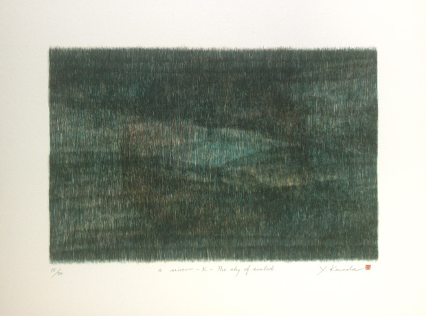私は1998年に新横浜の版画工房に通い、ドライポイント技法で版にニードルを使って時間をかけて版を作りました。下絵無しで、版を重ねながら、二人の職人にその場で色を指示して、プレス機で刷り上げて出来たものが、私の『ドライポイント・リトグラフ』の作品です。4版多色刷りで、何回も納得がいく色が出るまで色を重ねましたので、インクの盛りが重厚である事に特徴があります。ドライポイントの線の繊細さと独特の立体的な線の趣を大切にしながらも、また線の重なり具合で、おぼろげに浮かび上がる線の向こう側の空間を出したい、その一心で版をつくり、色を決めました。
